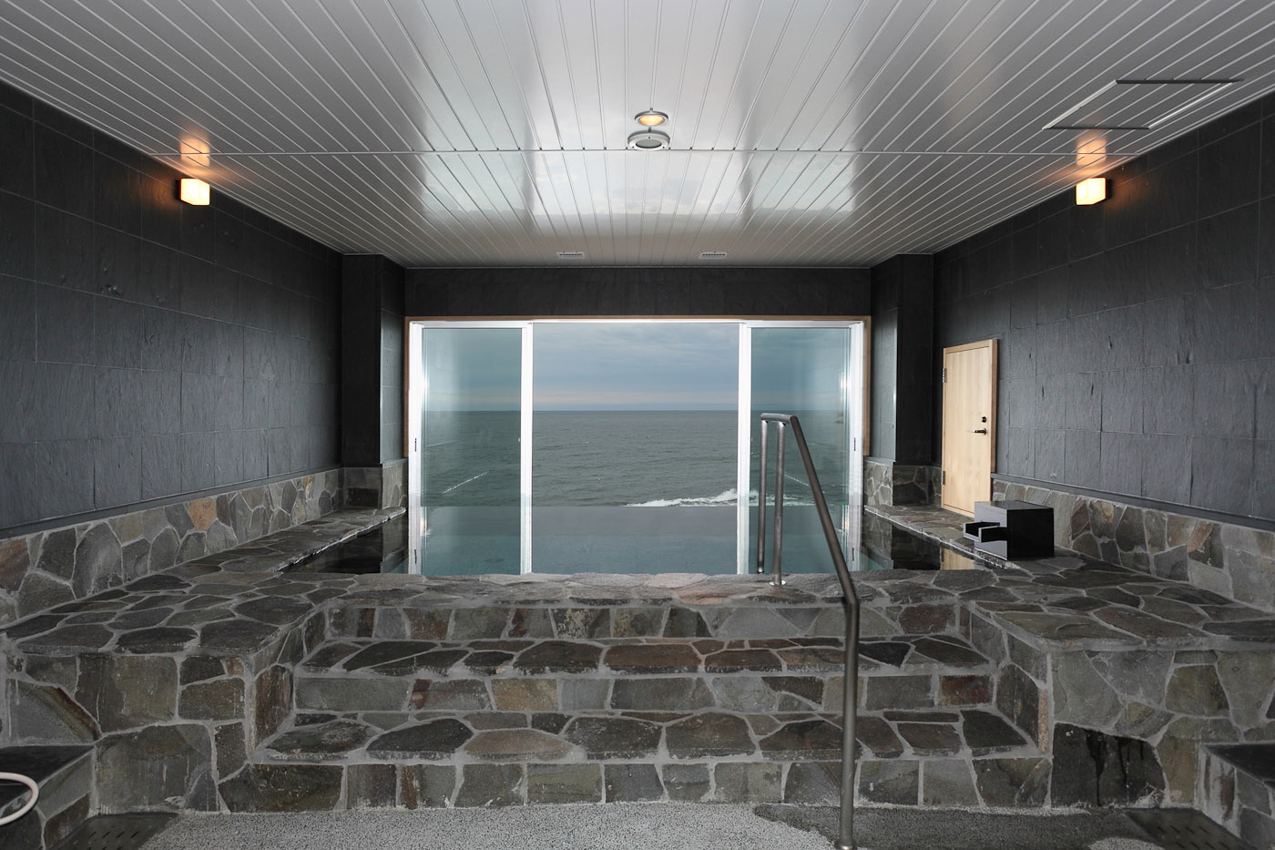改修された客室は、桧の半露天風呂を備えたこの宿のセミスイートの部屋になります。視界にはいつでも海を感じながら、茨城県産材の桧の香りや波の音が、訪れる人々の心と体を癒します。エントランスには『風の神の門』と銘を打った四つ脚門があり、その足元には日立で発見された5億1千年前のカンブリア紀地層の石を敷き込んだプロムナードとして設え、老舗旅館としての佇まいを創出しました。