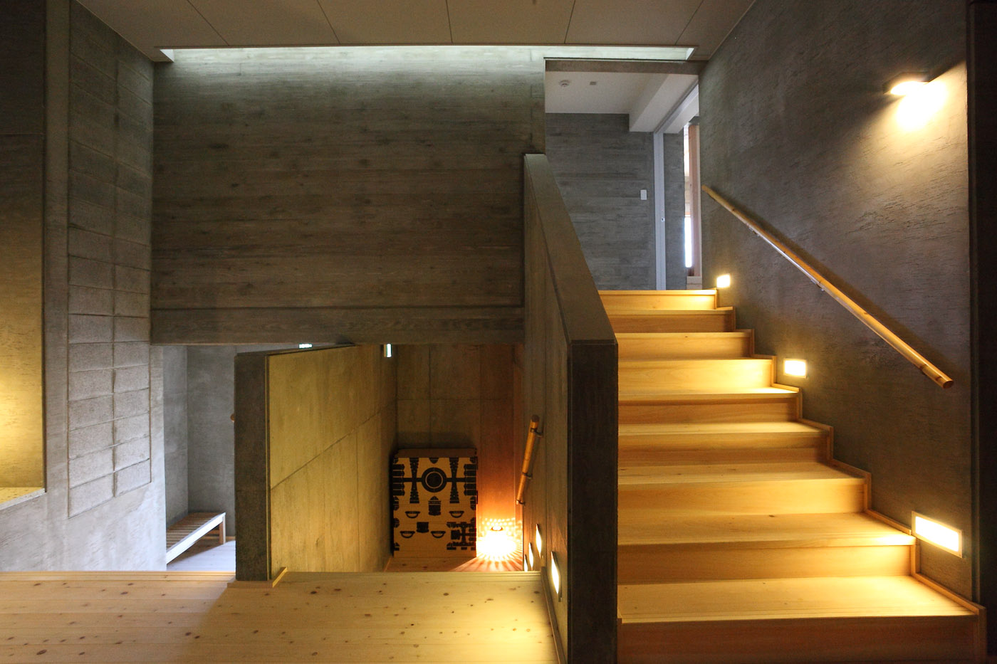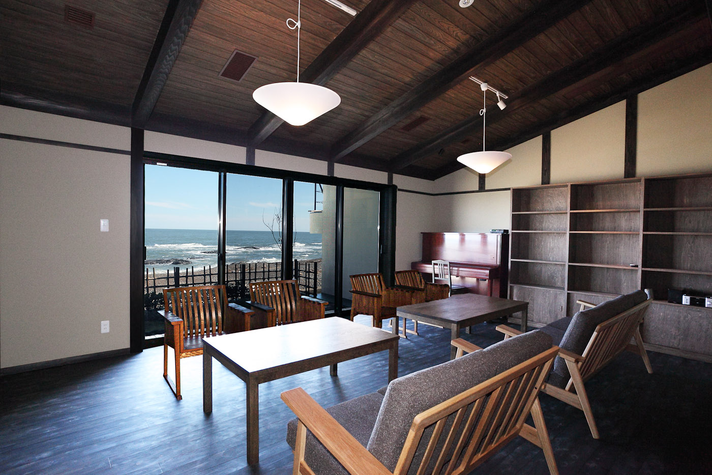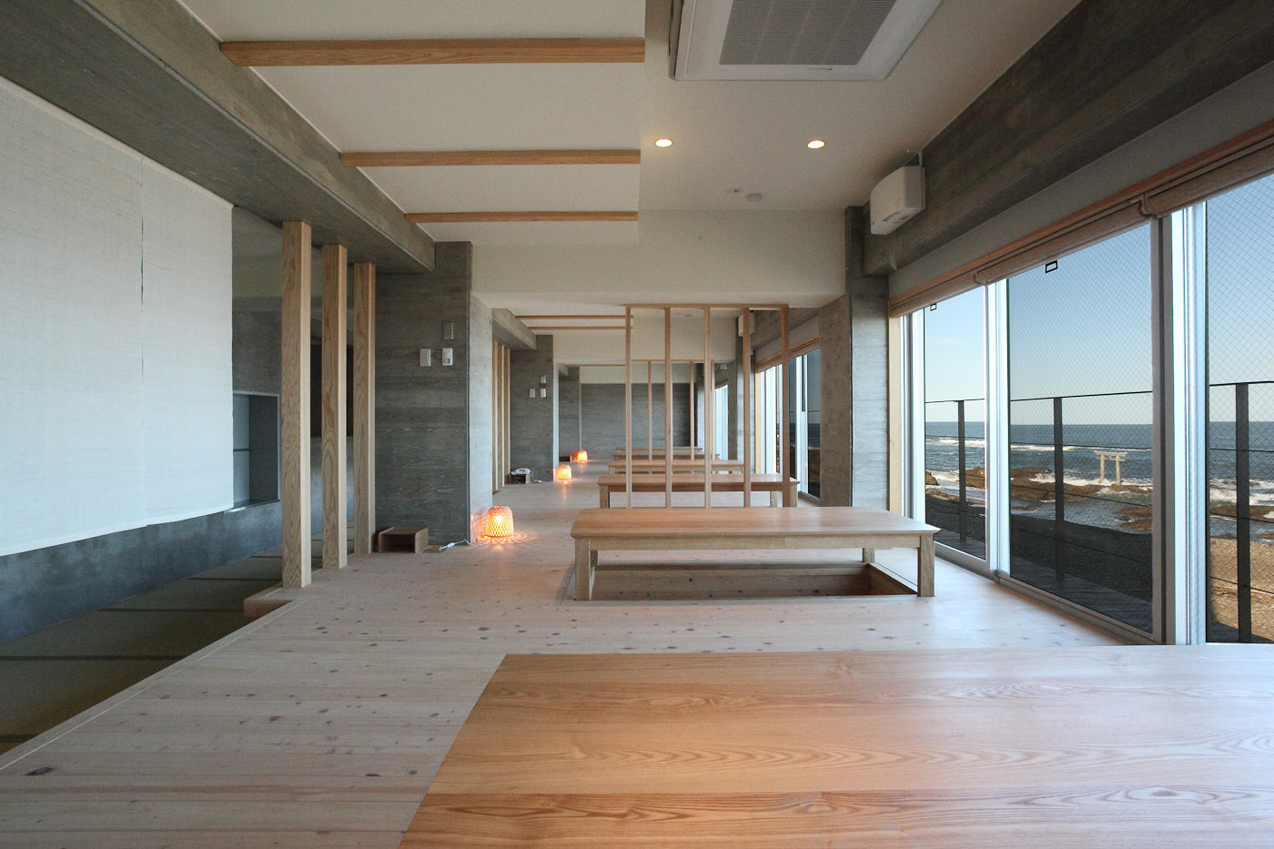 大洗海岸に建つ明治二十一年創業の老舗宿「金波楼」が名を「里海邸」と改め、常陸国のライフスタイルを楽しむ、「別荘風の宿」へと生まれ変わりました。都市の日常に疲れている生活者が求めている「心地よい田舎」という価値を高めるために、周辺環境と共生を意識しながら、「田舎の心地よい素材感」を顕在化するデザインを施しました。